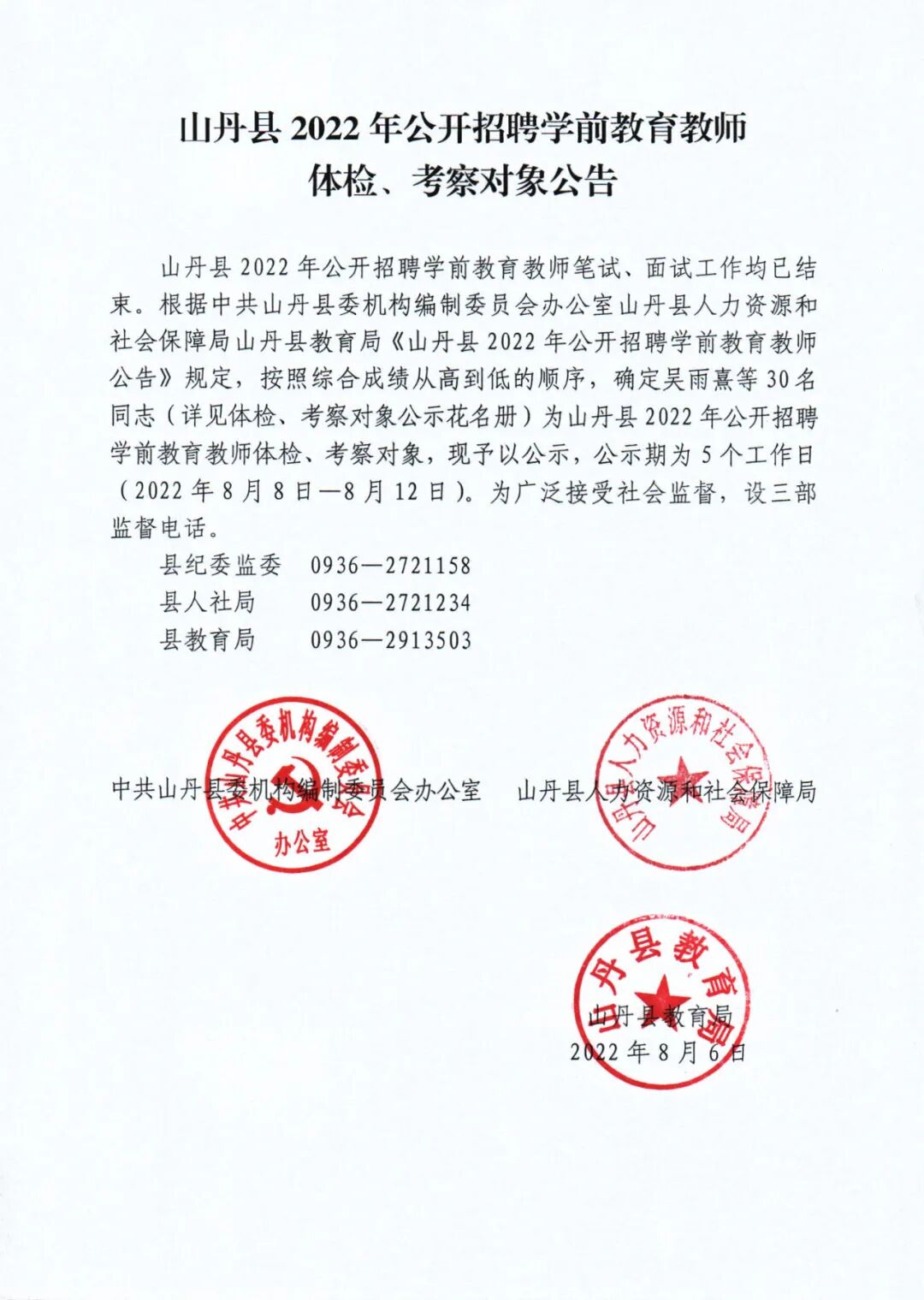山丹县2022年公开招聘学前教育教师体检、考察对象公告