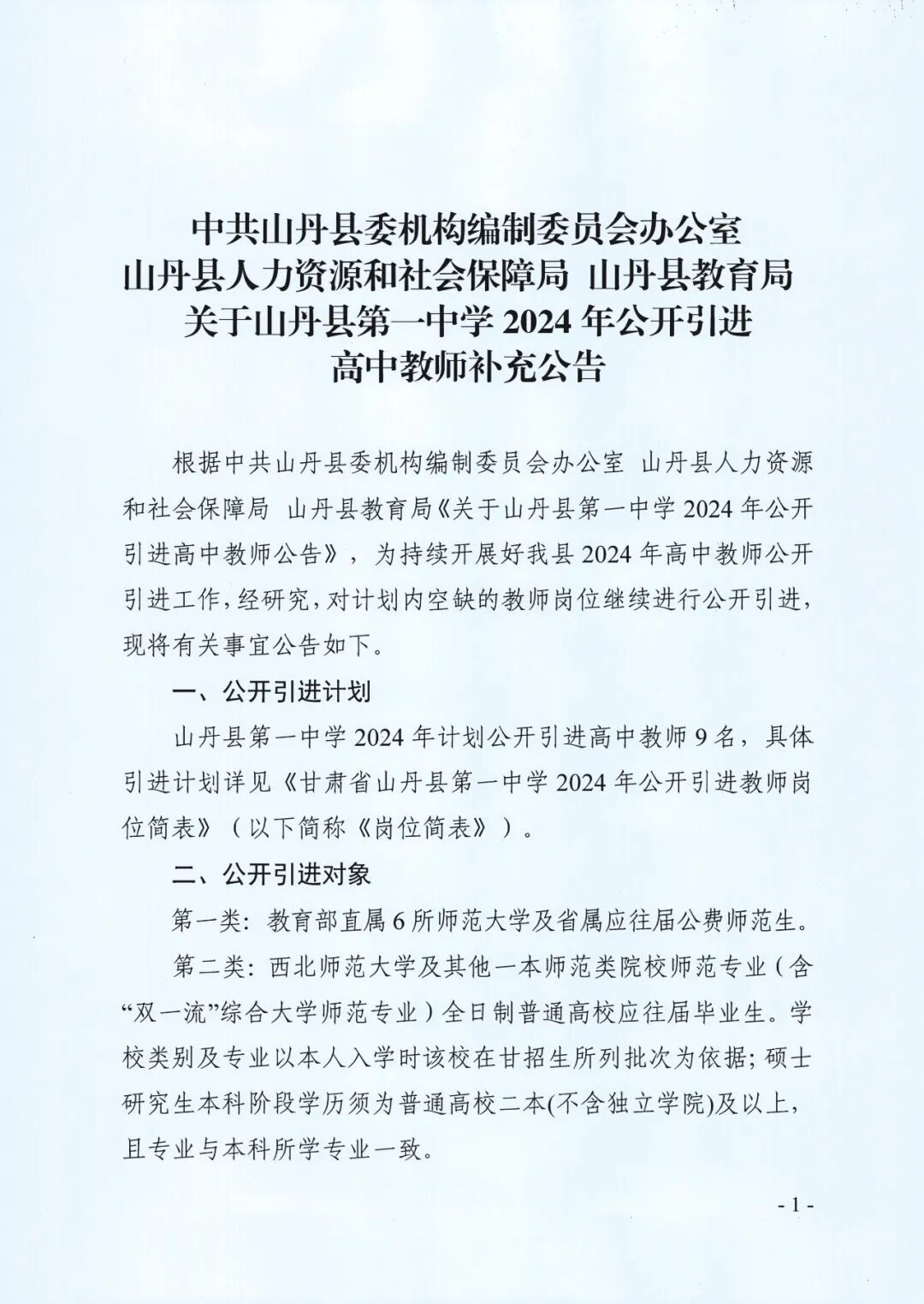 原文标题:关于山丹县第一中学2024年公开引进高中教师补充公告