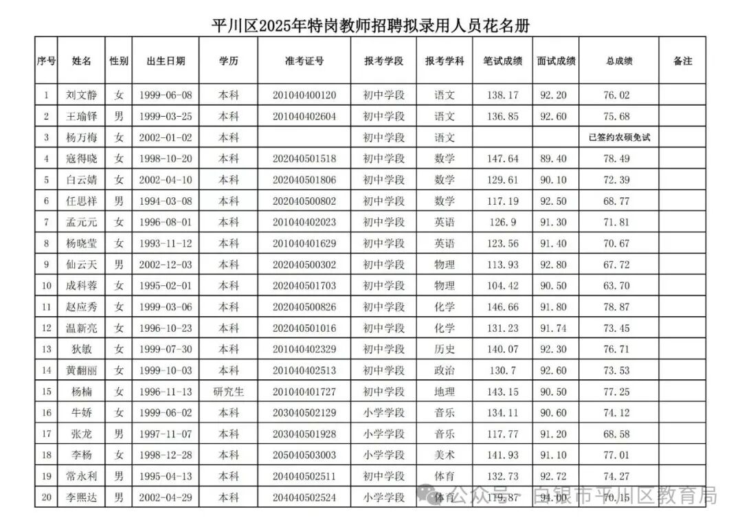根据《甘肃省教育厅 甘肃省财政厅关于做好2025年农村义务教育阶段学校教师特设岗位计划实施工作的通知》文件,经现场资格审核、面试、体检等程序,有20名考生确定为平川区2025年特岗教师招聘拟录取人员。现将拟录取人员名单予以公示。