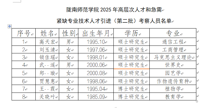 原文标题:陇南师范学院2025年高层次人才和急需紧缺专业技术人才引进(第二批)考察人员名单公示